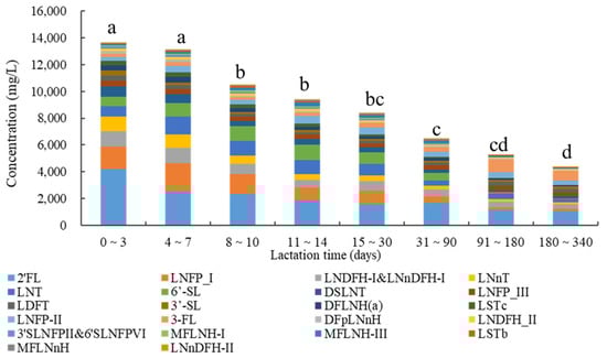 Concentrations of HMOs during different lactation periods are shown in Figure 3. The concentrations of total oligosaccharides showed a downward trend as lactation duration increased, with negative linear correlation between the total concentration of oligosaccharides and lactation time (r = −0.592, p < 0.0001). Comparing with the total concentration of oligosaccharides on lactation 0~3 day, the median of total oligosaccharides concentrations decreased by 2.5 g/L (day 8~10), 3.2 g/L (day 11~14), 4.2 g/L (day 15~30), 6.1 g/L (day 31~90), 8.3 g/L (day 91~180), and 9.0 g/L (day 181~340), respectively (all p < 0.01). There were no significant differences of total oligosaccharides between day 0~3 and day 4~7 (p = 0.713). Some specific oligosaccharides showed a downward trend in relation to lactation duration, such as 2′-FL, 3′-SL, LNnT, DSLNT, LSTc, DFLNH(a), and DFpLNnH. The concentrations of lacto-N-tetraose (LNT), LNFP-I, 6′-SL, and LSTb were highest during lactation day 4~7, day 4~7, day 11~14, and day 8~10, respectively. 3-FL showed an upward trend as the duration of lactation increased.