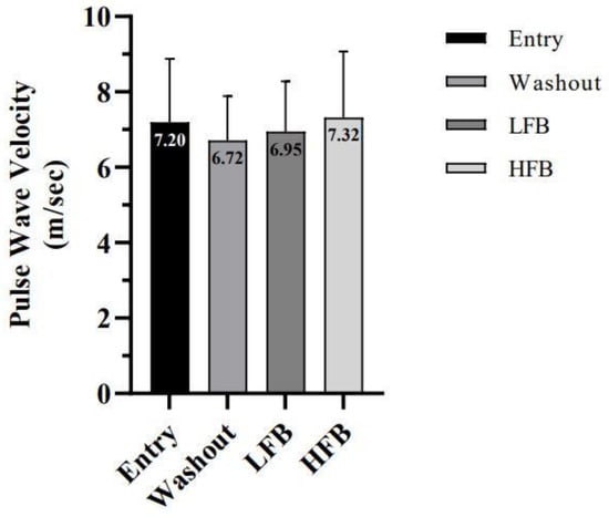Carotid–femoral pulse wave velocity. Values are for entry, washout, LFB intervention, and HFB intervention. Cross-over design (n = 23); values represent mean ± SD. Non-significant: p > 0.05.