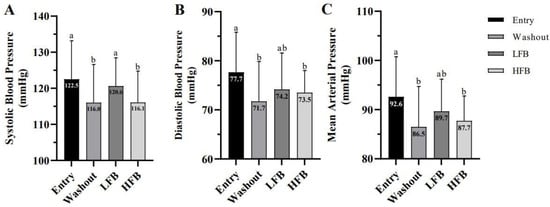 (A) Resting systolic blood pressure. (B) Resting diastolic blood pressure. (C) Mean arterial pressure. Values are for entry, washout, LFB intervention, and HFB intervention. Cross-over design (n = 21); values represent mean ± SD. Means without a common letter differ, p < 0.05.
