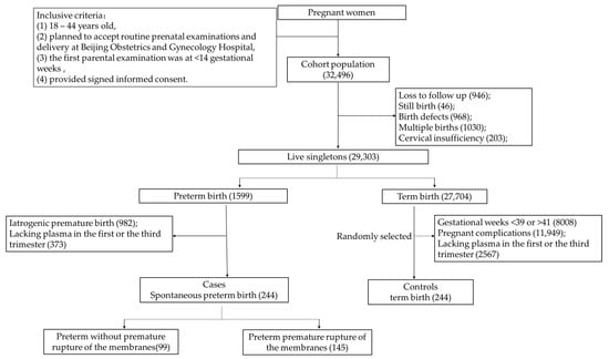 A nested case–control study was conducted based on a prospective maternal and child health cohort, the Beijing Birth Cohort Study (ChiCTR2200058395), in Beijing, China. In total, 32,496 pregnant women were recruited in the cohort from 2018 to 2020 at Beijing Obstetrics and Gynecology Hospital, Capital Medical University. We recruited women with the following inclusive criteria: aged 18–44 years old, with gestational weeks ≤ 14 weeks during recruitment, with no mental illness, and who could provide signed informed consent. Participants were examined and followed up until delivery. We collected maternal and fetal information prospectively when participants came to the hospital for an antenatal examination, and the information was recorded in the electronic clinical system. The ethics committee of Beijing Obstetrics and Gynecology Hospital, Capital Medical University, approved the study (2018-ky-009-01).