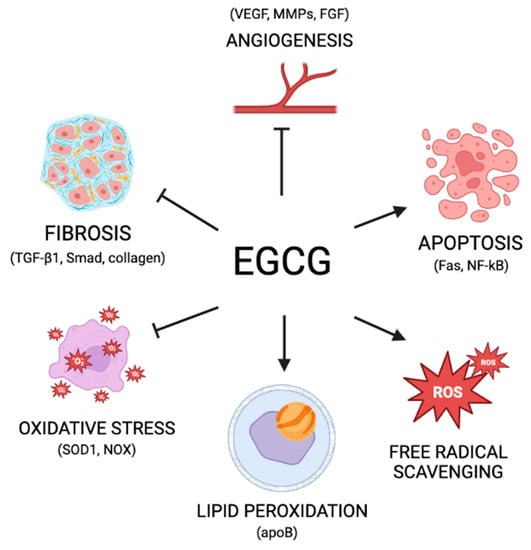 EGCG: anti-angiogenic effects: The formation of new blood vessels through angiogenesis is a process essential to cancer invasion and metastasis. The bloodstream provides nutrients to the tumor, allowing it to thrive and grow. This process is especially important in women’s reproductive health because reproductive tissues are highly vascularized and experience cyclic intervals of growth and revascularization [97]. In both cases, this process is largely driven by vascular endothelial growth factors (VEGFs) and fibroblast growth factors (FGFs) [97]. It has been shown both in vitro and in vivo that EGCG can significantly inhibit angiogenesis [98,99]. This effect is probably due to the compounding impact of several levels of EGCG intervention, including direct effects on proangiogenic factors (Figure 2). Primarily, EGCG has been observed to inhibit VEGF and FGF, directly inhibiting angiogenesis [100,101,102]. In addition, EGCG is known to have direct inhibitory binding interactions with many matrix metalloproteinases (MMP), proteins that promote ECM remodeling and drive the release of pro-angiogenic compounds such as VEGF [75]. In this way, EGCG can also inhibit angiogenesis through the inhibition of MMPs [103].
