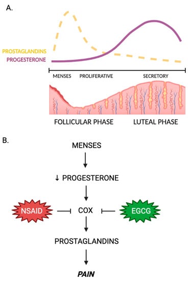 Possible actions of EGCG in dysmenorrhea. (A) Progesterone and prostaglandin concentrations are inversely related. During menses, a fall in progesterone activity stimulates the COX pathway to begin synthesizing prostaglandins. (B) A mechanistic scheme of the effects of NSAIDs and EGCG on the regulation of prostaglandin concentrations. Here, prostaglandin concentration is directly correlated with pain. ↓ = downregulation.
