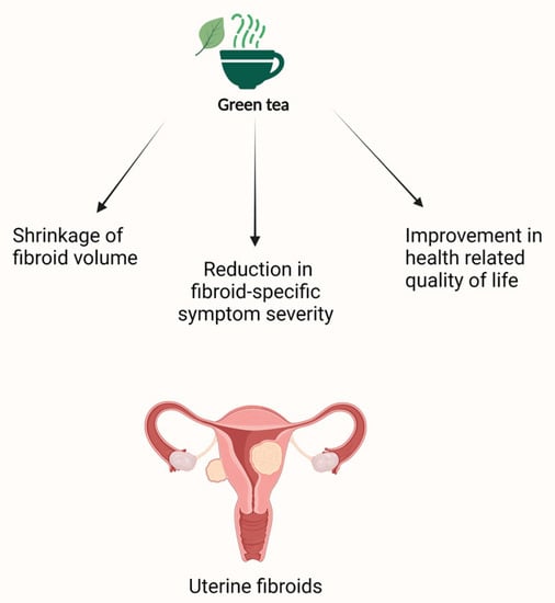 Uterine leiomyomas, also known as uterine fibroids, are the most common benign gynecological tumors. Fibroids affect up to 80% of reproductive-age women and cause a considerable healthcare burden [132,133]. Fibroids are composed of monoclonal cells that arise from the smooth muscle of the uterus, but the exact etiopathogenesis of their growth remains unclear [134]. Depending on their size and location, fibroids can present with bleeding symptoms (heavy, prolonged, or painful menses), bulk symptoms (constipation, urinary frequency, pelvic pressure), or both. Fibroids are also associated with subfertility [135]. Hormonal medications are commonly used to provide temporary symptom relief, but the definitive treatment remains surgical (myomectomy or hysterectomy) [136]. Both modifiable and non-modifiable risk factors have been associated with the development of fibroids. These include age, race, sex hormones, obesity, genetics, diet, and lifestyle factors. Several studies suggest that the consumption of certain nutrients, including green tea, affects fibroid growth [137,138].