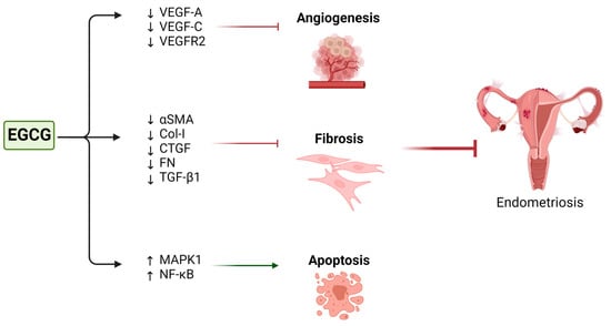 Schematic presentation of the possible roles and mechanisms of green tea in endometriosis. ↓ = downregulation; ↑ = upregulation.