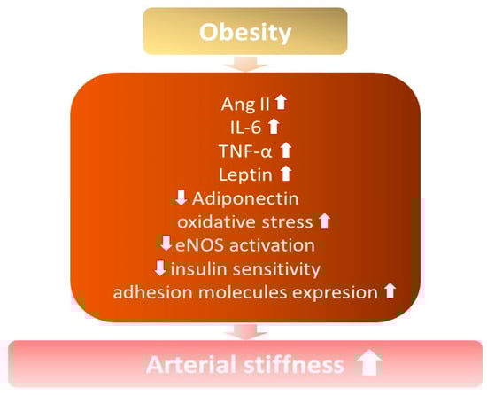 The influence of obesity on the development of increased arterial stiffness. ↓—decrease; ↑ —increase; Ang II—angiotensin II; IL-6—interleukin 6; TNF-α—tumor necrosis factor; eNOS—endothelial nitric oxide synthase.