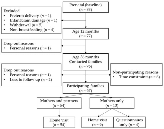 This study is part of the longitudinal BINGO study investigating early prenatal and postpartum predictors of child development [41,42]. Participants were parents and their children, recruited in the Netherlands during pregnancy in 2014/2015 (n = 88). Postnatal exclusion criteria were pregnancy complications, birth weight <2500 g, gestational age at birth <37 weeks, 5 min Apgar score <7, and congenital malformations [41]. After birth, eleven participating families were excluded, either because inclusion criteria were not met, or withdrawal due to personal circumstances. After one drop-out during the first postnatal year, 76 families were contacted at the 36-month measurement round (2017/2018) and 67 agreed to participate (see participant flowchart in Figure 1). Of these 67 participants, 4 mothers did not breastfeed during the first postnatal weeks and thus did not provide milk samples, resulting in a total number of 63 participants for the current study. All the analyses were first performed on data from exclusively breastfed children during the first 12 postnatal weeks (n = 45, including two infants who received one formula feeding a week) to avoid potential effects of formula feeding on behaviour. Subsequently, the analyses were repeated with the whole group of infants (n = 63), correcting for percentage breastfeeding (see HMOs section).