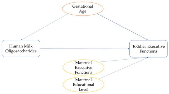 Human milk is considered the best nutrition for an infant because of its beneficial effects on child development and on maternal and child health [1]. For example, human milk is shown to protect against infections during infancy and metabolic diseases in later life [2]. Moreover, breastfeeding parameters, such as the initiation and duration of breastfeeding, have been related to improved child neurodevelopment and cognition [2,3]. Increasing evidence also shows that not only breastfeeding parameters, but also specific constituents of human milk, are related to child behavioural and cognitive outcomes (for a review see de Weerth et al. [1]). This concept of human milk determining the trajectory of development with long-term consequences for the phenotype is also known as Lactocrine Programming [4,5,6]. Human milk oligosaccharides (HMOs) are the most abundant solid component in human milk after lipids and lactose [7]. With respect to Lactocrine Programming, HMOs are of interest because of their potential beneficial effects on child neurodevelopment [7,8]. However, to date, the few studies that investigated HMOs’ associations with child cognition focused on general cognition and language, and reached the age of 24 months [9,10,11,12]. The current study extends these first findings by investigating, in a healthy community sample, the longitudinal associations between HMOs in the first weeks of life and executive functions, which represent higher cognitive abilities, at a child age of three years.