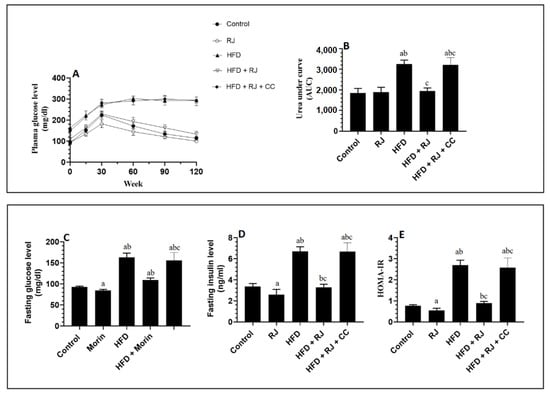 Changes in glucose levels during the oral glucose tolerance test (OGTT) and its corresponding area under the curve (AUC) (A,B), as well as changes in the fasting plasma glucose (C), fasting plasma insulin (D), and HOMA-IR (E) in all groups of rats. Data are presented as means ± SD (n = 8/group). a: vs. control; b: vs. RJ-treated control rats; c: vs. HFD-model rats; RJ: royal jelly; HFD: high-fat diet; CC: compound C, an AMPK inhibitor.