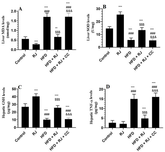 The hepatic levels of TNF-α, IL-6, and lipid peroxides (MDA) were significantly higher in the levels of total GSH and SOD in the livers of the HFD-fed rats compared to the control or RJ-treated rats (Figure 3A–D). The levels of GSH and SOD were significantly increased but the levels of TNF-α, IL-6, and MDA were significantly reduced in the livers of HFD + RJ-treated rats compared to the HFD-fed rats (Figure 3A–E). In addition, the levels of SOD and GSH were significantly higher but the levels of MDA were significantly lower in the livers of the RJ-treated control rats compared to the control rats administered the vehicle (Figure 3A–E). However, the levels of all these inflammatory/oxidant/antioxidant markers did not vary between the HFD + RJ + CC-treated rats and HFD-model rats (Figure 3A–E).