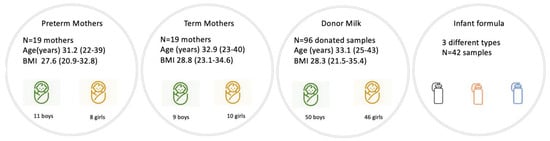 All mothers conceived spontaneously. Maternal demographics, e.g., maternal age, body mass index (BMI), infant sex, and mode of delivery, did not differ between the mothers who gave birth to term infants and those who gave birth to preterm infants. The average gestational age in the preterm group (33.5 ± 1.1 weeks) was significantly lower compared to the term group (39.7 ± 0.6 weeks). The mothers participating in the study were all of White race. None of the mothers had chronic health conditions, e.g., diabetes previously or throughout their pregnancy or lactation period, and none of them followed any special diet or took any medication during lactation. The mothers participating in our study were taking prenatal vitamins and magnesium, folic acid, or iron supplementation in recommended doses. Maternal BMI was measured in the 4th postpartum week when the first milk sample was collected from the participants. The time interval between childbirth and donation for the donor mothers was 125.4 ± 13.1 days (Figure 1).