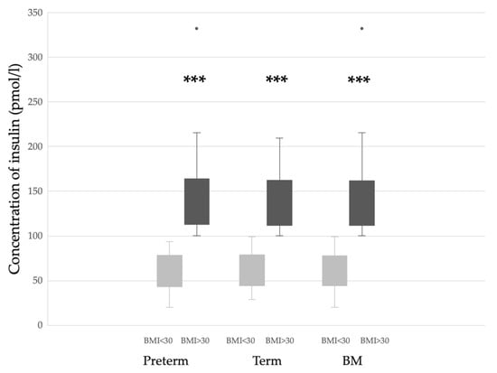 Impact of BMI on the insulin concentration of preterm or term breast milk and the combined group of breast milk (BM) samples. *** p < 0.001 versus BMI < 30.