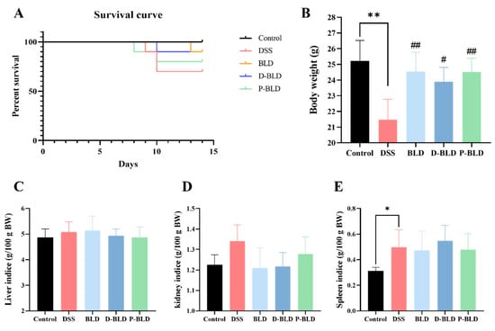 By constructing a model of DSS-induced colitis, it was possible to detect and compare the beneficial effects of S. boulardii and its postbiotic application. The survival curves showed that S. boulardii and its postbiotics treatment temporarily delayed the death of the mice, which showed higher survival rates (Figure 2A). Weight loss, a typical feature of colitis, was significantly lower in mice in the DSS group compared with the Control group (Figure 2B, p < 0.01), the intervention reversed the weight loss, with the BLD and P-BLD groups (p < 0.01) showing better weight recovery than the D-BLD group (p < 0.05). The liver, kidney, and spleen indices of the mice in each group were examined, which can reflect the biological function of the organ to some extent. Among them, the spleen, as an important peripheral immune response organ, is capable of producing antibodies and other active substances, and is stimulated by immune activation in DSS-induced colitis thus causing enlargement. The results showed that the spleen index increased in the DSS group compared with the Control group, with a significant difference (p < 0.05). There were no significant changes for liver and kidney indices among all the groups (Figure 2C,D).