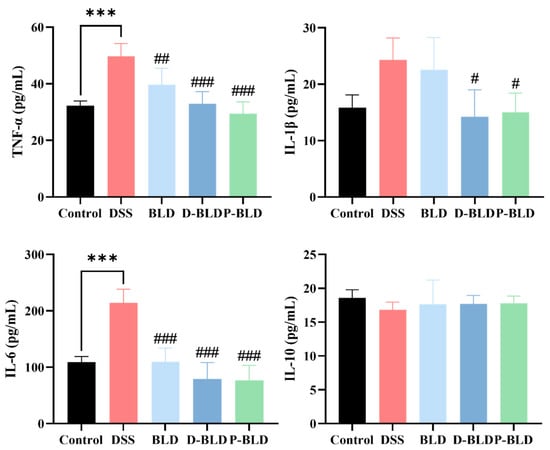 The increase of pro-inflammatory factors and decrease of anti-inflammatory factors are typical features of colitis, which can reflect the development process and severity of colitis. The effect of S. boulardii and its postbiotics on serum inflammatory factors in mice with DSS-induced colitis was detected using an ELISA kit, and the results are shown in Figure 4. The levels of IL-6 and TNF-α in serum were significantly increased in the DSS group compared with the Control group (p < 0.001). Compared with DSS, the levels of TNF-α (p < 0.01) and IL-6 were significantly lower (p < 0.001) after the intervention of S. boulardii (i.e., BLD group). The intervention effect was more obvious in D-BLD and P-BLD groups, which showed a significant decrease in IL-6 and TNF-α levels (p < 0.001) and IL-1β levels (p < 0.05). There was no significant difference in IL-10 levels between the groups. The results showed that both S. boulardii and its postbiotics were able to alleviate the symptoms of colitis caused by DSS by reducing the expression of pro-inflammatory factors, and the intervention effects of postbiotics were better than those of S. boulardii. In summary, this shows that postbiotics may have stronger immunomodulatory effects.