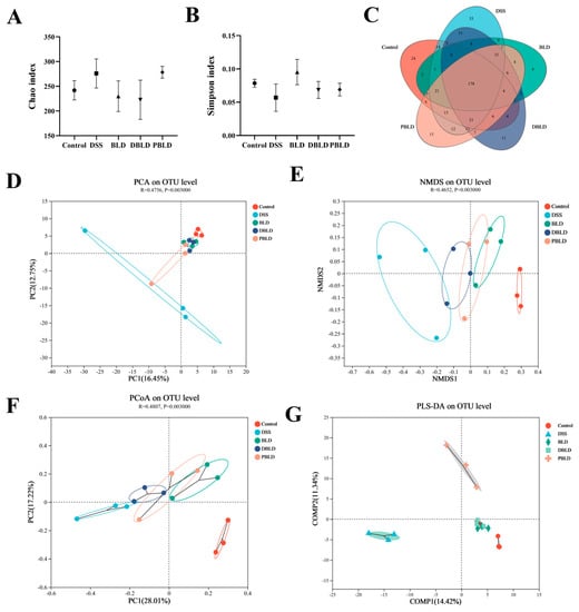 Analysis of intestinal microbial diversity. (A) Chao index. (B) Simpson index. (C) Venn diagram. (D) PCA analysis. (E) NMDS analysis. (F) PCoA analysis. (G) PLS–DA analysis. Note: The above gut microbial analyses were based on OTU levels.