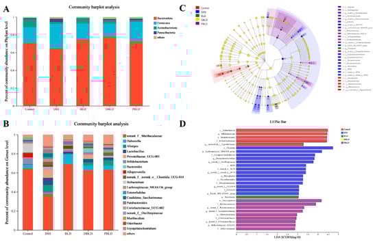 Analysis of the composition of the gut microbial community. (A) Composition of the gut flora at the portal level. (B) Composition of the gut flora at the genus level. (C) LEfSe Cladogram (the rings, from outer to inner, represent genus, family, order, class, and phylum). (D) Indicator bacteria with LDA scores of >2 in five groups.