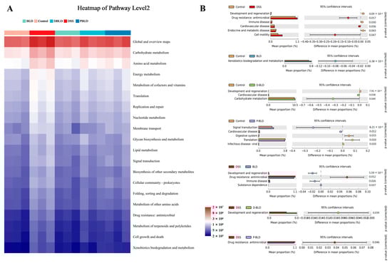 Predicted function of the fecal microbiome based on KEGG pathways. (A) Heatmap of Pathway Level2. (B) Important pathways associated between two groups. Statistically significant difference was performed using the unpaired two-tailed Welch’s t-test (p < 0.05) in STAMP.