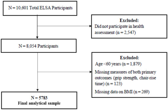 This study is a cross-sectional analysis of Wave 6 of the English Longitudinal Study of Ageing (ELSA), an ongoing study of community-dwelling adults aged ≥50 years in England. Full details are reported elsewhere [24]. In brief, Wave 6 took place in 2012–2013 and included 10,601 participants [24]. Data were collected through interviews and self-completion questionnaires, with 8054 completing a health assessment of physical function [25]. ELSA was conducted in line with the Declaration of Helsinki and was approved by the London Multicenter Research Ethics Committee. Written ethical consent was obtained for all waves and components of ELSA, according to the ethical approval system in operation at the time [24]. The inclusion criteria for the present study were as follows: adults > 60 years, who participated in the health assessment, with recorded data for hand grip strength, chair rise test, and BMI (Figure 1).