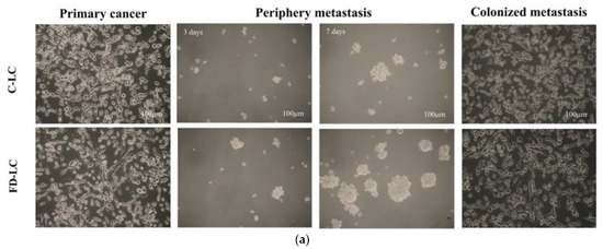 FD effect on lactate production and metastatic potential of LC growing at tumor malignancy stages. (a) Representative image of LCs growing in the control (C) and low folate-deficient (FD) medium at various stages of cancer malignancy. The culture protocols and treatments were detailed in the Methods section. Numbers of epithelial mesenchymal transition (ME) cells and oncospheroids growing at (b) primary cancers, (c) periphery metastases, and (d) recolonized metastases stages were quantified for the control and FD cells. (e) Lactate production, (f) expression of stemness marker SOX2, (g) migration, and (h) invasion of the control and FD-exposed cells growing at various malignancy stages. Data are expressed as the mean ± SD (n = 6 in each group). Statistical significance was analyzed by Student’s t-test (b–d) or by one-way analysis of variance, followed by Duncan’s multiple range test (e–h). Values without a common letter differed at p < 0.05. * indicates the comparison between the control group and FD groups by Student’s t-test at p < 0.05.
