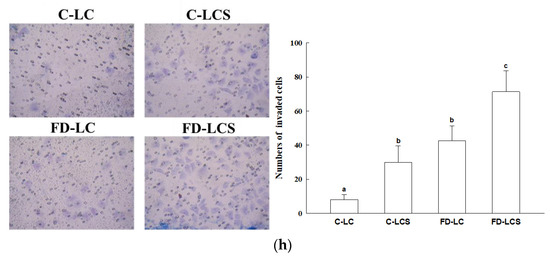 The causal effect of FD exposure on lactate production and metastatic potential of LC was investigated. To recapitulate tumor pathological course during cancer malignancy, LCs were cultivated on a monolayer growing as the primary tumors and cultured in control and FD medium for 4 days. The primary LCs were passaged into low-adherent plates for anchorage-independent oncospheroids’ growth for 7–9 days, designated as LCSs, to mimic aggressive tumors in periphery metastasis. These oncospheroids were then re-cultured into monolayers as the distant metastatic colonized tumors stage (Figure 1a). Compared with the LC cultivated in the control medium (C-LC), FD-LC induced the epithelial mesenchymal transition (EMT) phenotype, evident by significantly increased numbers of mesenchymal elongated cells (Figure 1a,b). Under anchorage-independent growth, FD-LC vs. C-LC cells formed larger oncospheroids (FD-LCSs) with 3-fold increased numbers of oncospheroids (Figure 1a,c). FD-LCS cells re-established EMT phenotype with 3-fold increased numbers of adherent cells (Figure 1a,d). As lactate release was measured under various LC growing stages, both C-LC and C-LCS had slight lactate production whereas FD-LC and FD-LDS displayed a significant 4–5-fold increase in lactate levels compared with their counterpart controls, with the highest lactate production by FD-LDS (Figure 1e). Expression level of the stemness marker, Sox2, as the metastatic index, was the highest in FD-LDS followed by FD-LD, whereas C-LC and C-LCS expressed significantly lower Sox2 levels compared with the FD counterparts (Figure 1f). FD-LCS displayed the highest metastatic potential as compared with the FD-LC and the control counterparts, evident by significant increased migration (Figure 1g) and invasive LC numbers (Figure 1h).