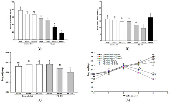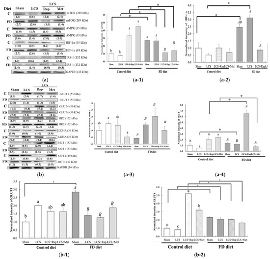 Dietary FD and LC invasion activated the metabolic stress–mTOR-signaling pathways. Representative gel image (a) and total and/or phosphorus–protein expressions levels in (b) Akt, (c) mTORC1, (d) S6K1, and (e) HIF1α of the control and FD mice in the absence (sham) and presence of LC transplantation were quantified by Western blot analysis. All the phosphorylated proteins were normalized by their respective unphosphorylated form. Statistical significance was analyzed using one-way analysis of variance, followed by Duncan’s multiple range test within each dietary treatment group. Values compare within Control diet with lowercase letters and FD diet with uppercase at p < 0.05. * indicates the comparison between the control group and FD groups through Student’s t-test at p < 0.05.