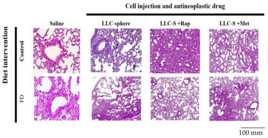 We evaluated the drug effects of rapamycin (Rap), an mTORC1-signaling blocker, and the anti-diabetic drug metformin (Met) on FD/LCS-potentiated cancer metastasis. As shown in Table 2, the FD-LCS transplantation to the FD mice resulted in a 100% metastatic tumor colonization rate (8/8) with LC type of lung carcinoma and sarcomas in the pectoral muscle of the thorax, similar to the FD-induced tumorigenicity rate in our prior findings in Table 1 and Figure 2. Pre-treatment of the FD/LCS-implanted mice with Rap and Met drugs essentially prevented LC metastasis in lung and thorax tissues, resulting in a 0% metastatic tumor colonization rate (0/6). Neither Rap nor Met pre-treatment of the LCS-implanted mice fed with the control diet affected the 0% metastatic tumor colonization rate found in the control/LCS-implanted mice. Histological examination of lung tissues of these experimental mice revealed pathological lesions with chronic inflammation and lymphocyte aggregation in tumor-associated lungs of the FD/LCS-implanted mice compared with lungs of the control and FD sham mice (saline injection) (Figure 5). Rap and Met treatment of the LCS-transplanted control and FD mice did not result in any pre-cancerous lesions in lungs. The data suggested that Rap and Met treatment inhibited LCS metastases in the FD mice with no cancer effect on the control mice.
