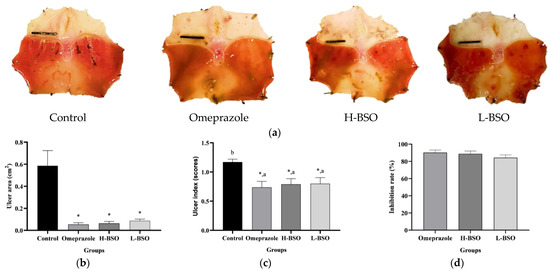 Gross gastric lesions (a), ulcer gastric areas (b), ulcer index score (c), and percentage of inhibition rate (d) in rats with ethanol-induced gastric ulcers pretreated with distilled water, omeprazole, 100% black seed oil (H-BSO), and 50% black seed oil (L-HSO). * Significantly different from the control at p < 0.05. Different letters (a–b) indicate significant differences (p < 0.05) between groups determined by Duncan’s multiple-range test. Scale bar = 1 cm.