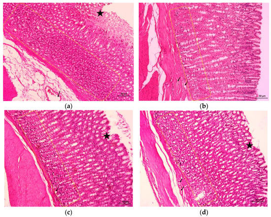 Figure 2a shows severe disruption of the surface epithelium (black star), very dense inflammatory cell infiltration of the mucosal layer (yellow dotted border), and extensive edema and vasodilation (black arrow) of the submucosa layer with acute oral administration of 80% ethanol-induced gastric ulcers in the control group. Meanwhile, pretreatment of the gastric tissues with 20 mg/kg omeprazole demonstrated no disruption of the surface epithelium, no edema of the submucosa layer, and only a light infiltration of inflammatory cells in the mucosal layer (Figure 2b). Similarly, pretreatment with H-BSO and L-BSO resulted in minimal disruption to the surface epithelium and few infiltrations of inflammatory cells in the mucosal layer when compared with the control group (Figure 2c,d).