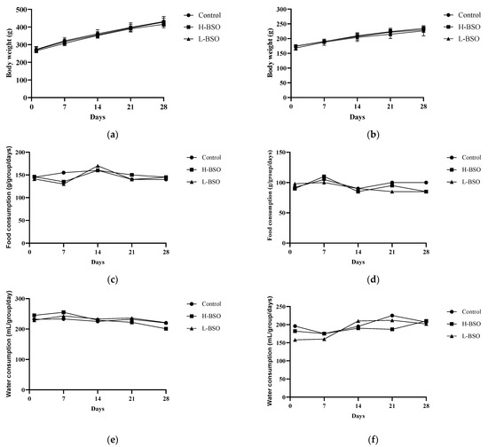Body weight, food consumption, and water consumption of rats ((a,c,e): male; (b,d,f): female) after administration of H-BSO and L-BSO for 28 days. Values are expressed as ± standard error of the mean; one-way analysis of variance followed by Tukey test (n = 6 animals/group). Differences between groups were considered to be significant at p < 0.05.
