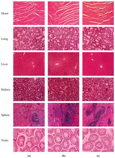 All vital organs were preserved in 10% formalin, dehydrated, embedded, sectioned, mounted, and counterstained with H&E; then, histopathologic examinations were performed.