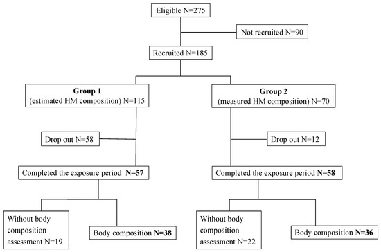 The exposure period was defined by feeding fortified HM for at least 2 weeks. Recruited infants were dropped out if they were fed formula for two or more days with a >12.5% daily volume intake, or if they were transferred or deceased before completing the exposure period.