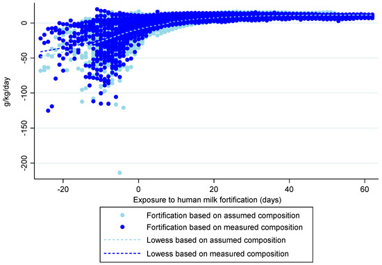 Weight gain velocity model in both groups, from birth to discharge, using a lowess smoother. Day ‘0’ indicates the starting day of exposure to human milk fortification.