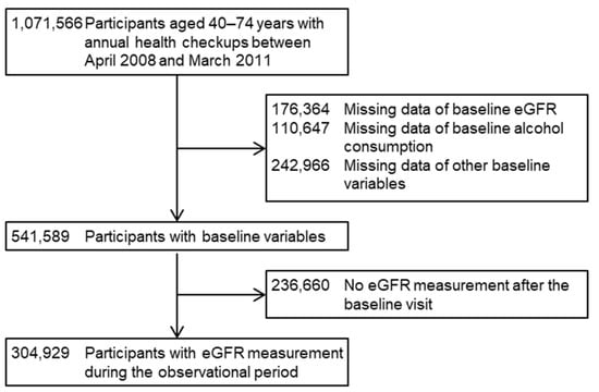 This study included 1,071,566 participants who were eligible for the study, aged 40–74 years and underwent their annual health checkups in 26 prefectures in Japan between April 2008 and March 2011. The details of the design of this retrospective cohort study are described elsewhere [32,33]. The initial visit between April 2008 and March 2011 was set as the baseline date. After excluding (i) 176,364 (16.5%) participants with a missing baseline estimated GFR (eGFR), (ii) 110,647 (10.3%) participants with a missing baseline alcohol consumption, (iii) 242,966 (22.7%) participants with missing data on other baseline variables, and (iv) 236,660 (22.1%) participants who had no eGFR measurement during the observational period between their baseline visit and the end of the study in March 2012, we finally included 304,929 (28.5%) participants from 18 prefectures (Hokkaido, Ibaraki, Tochigi, Saitama, Chiba, Niigata, Ishikawa, Fukui, Nagano, Gifu, Osaka, Tokushima, Fukuoka, Saga, Nagasaki, Kumamoto, Miyazaki, and Okinawa) (Figure 1). The study protocol was approved by the Ethics Committees of Fukushima Medical University (No. 2771) and Osaka University Hospital (No. 24086-9).