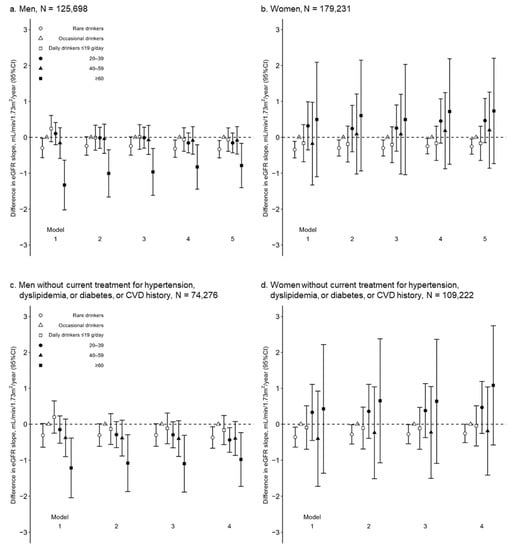 Differences in eGFR slope (ß3, mL/min/1.73 m2/year) among alcohol consumption categories in multivariable-adjusted linear regression models in 125,698 men (a) and 179,231 women (b); and 74,276 men (c) and 109,222 women (d) without current treatment for hypertension, dyslipidemia, or diabetes, or CVD history. CI, confidence interval; CVD, cardiovascular disease; eGFR, estimated glomerular filtration rate. Model 1 unadjusted; Model 2 adjusted for age (year); Model 3 adjusted for age (year) and urinary dipstick protein (−, ±, 1+, 2+, and ≥3+); Model 4 adjusted for covariates in Model 3, body mass index (kg/m2), mean arterial pressure (mmHg), hemoglobin A1c (%), high-density lipoprotein cholesterol (mg/dL), uric acid (mg/dL), and current smoking; Model 5 adjusted for covariates in Model 4; current treatment for hypertension, dyslipidemia, and diabetes; and CVD history.