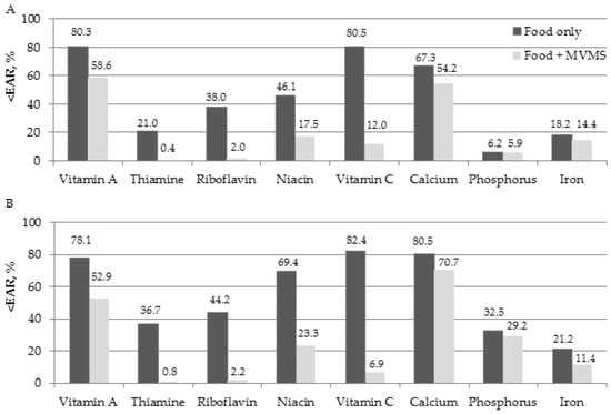 The percent of elderly whose intake was below EAR before and after taking MVMS in the MVMS user group; (A) males and (B) females. Abbreviations: EAR, estimated average requirement; MVMS, multi-vitamin and mineral supplements.