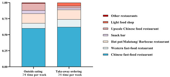 The results of this study indicate that the majority of Hunan college students (59.53%) prefer Chinese fast food as their top choice when eating out, followed by hot pot/malatang/barbecue (11.7%) and upscale Chinese food restaurants (11.03%) (Figure 1). Furthermore, Chinese fast-food restaurants are also the most popular choice for ordering takeaway among the participants, accounting for 62.00% of all orders, with Western fast-food restaurants coming in second place (12.10%). Unlike eating out, students still considered light food shops when ordering takeaways (0.00% vs. 0.05%). In summary, the findings suggest that Chinese fast-food restaurants are the most commonly selected food establishments by college students in Hunan, both for eating out and ordering takeaways.