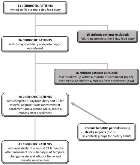 Among the 111 cirrhotic patients enrolled, only 96 patients completed the 3-day food diary and another 16 patients were excluded because they were lost to follow-up (n = 12) or because they underwent LT (n = 4) within 6 months of registration. Therefore, the study includes 80 cirrhotic patients. To verify possible associations between the consumption of soluble sugars and changes in visceral fat and muscle mass, we used a second CT that a subgroup of 41 cirrhotic patients had done for clinical reasons after 6 months from enrollment. We then compared the VATI and skeletal muscle index (SMI) measured at enrollment with those after 6 months (Figure 1). The study was performed in accordance with the Declaration of Helsinki, approved by the Ethics Committee of Policlinico Umberto I (Ref. No. 3420), and written informed consent was obtained from all participants.
