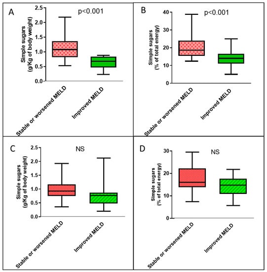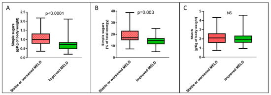 Boxplots of the amount of dietary carbohydrates consumed each day according to temporal changes in MELD score by all cirrhotic patients. (A) Intake of simple sugars expressed in g/Kg of body weight; (B) intake of simple sugars expressed as a percentage of total energy; (C) intake of starch. NS: not significant.