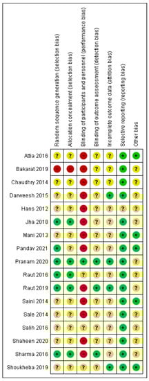 - Higgins, J.P.T.; Altman, D.G.; Gøtzsche, P.C.; Jüni, P.; Moher, D.; Oxman, A.D.; Savovic, J.; Schulz, K.F.; Weeks, L.; Sterne, J.A.C. The Cochrane Collaboration’s tool for assessing risk of bias in randomised trials. BMJ 2011, 343, d5928. [Google Scholar] [CrossRef] [PubMed]