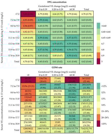 Multivariable adjusted GAM analyses showed that the first-trimester VE concentration was related to FPG levels (Figure 2a) and GDM risk (Figure 2b) in a L-shaped pattern; the FPG levels and GDM risk decreased sharply to a threshold (around 7 mg/L), and then they were kept flat. The association of gestational VE change to the FPG levels is presented as a reverse J-shaped curve, and the GDM risk is presented as a declining curve. Gestational VE decrease was associated with increased FPG levels and GDM risk (Figure 2c,d). Considerable differences in the FPG levels and GDM risk according to the combination of the first-trimester VE concentration and gestational VE change were identified (Figure 3). Higher FPG levels and GDM risks were found in women with lower first-trimester VE concentration and greater gestational VE decrease.