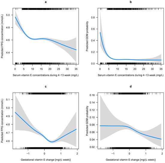 Figure 2. Predicted concentration of FPG and risk of GDM with respect to gestational vitamin E (VE) status. Predicted concentration of FPG and the 95% CIs were calculated with respect to (a) the first-trimester VE concentrations and (c) the gestational VE change by employing generalized additive models. Predicted risk of GDM and the 95% CIs were also calculated with respect to (b) the first-trimester VE concentrations and (d) the gestational VE change by employing generalized additive models. All models were adjusted for region, household registration, education, ethnic origin, age, ART, primigravida, pre pregnancy BMI, hypertension, and FPG levels at gestational age of 4–13 weeks, as well as the confounding of the first-trimester VE concentrations and the gestational VE change on each other.