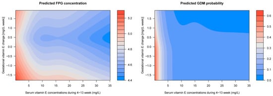 The associations of the first-trimester VE concentration and the gestational VE change with FPG and GDM were identified by performing generalized additive models (GAMs) with smooth functions implemented in the Mgcv version 1.8 package in R statistical software. All models were adjusted for the nine covariates and FPG levels at gestational age of 4–13 weeks, and the confounding of the first-trimester VE concentration and the gestational VE change on each other. According to the models, predicted concentration of FPG and risk of GDM with 95% confidence intervals (CIs) were calculated with respect to the first-trimester VE concentration and the gestational VE change. Subsequently, we used the visreg 2.7.0.3 package for visualizing these regression models. Heatmaps were constructed to exhibit the differences based on combinations of the first-trimester VE concentration and the gestational VE change (red represents high FPG level or GDM incidence, blue represents low FPG level or GDM incidence).