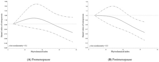 Multivariable adjusted hazard ratios (95% confidence intervals) for the non-linear relationship between the phytochemical index and osteoporosis stratified by (A) premenopause and (B) postmenopause. The model was adjusted for age, alcohol consumption, household income, education level, smoking status, physical activity, body mass index, and dietary intakes of total energy and calcium, and vitamin D.