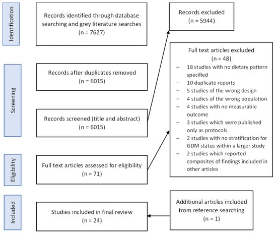 This scoping review summarises the literature surrounding the relationship between dietary patterns and cardiometabolic risk in women with a history of GDM. Twenty-four studies met the inclusion criteria. Women with a history of GDM are up to 10 times more likely to develop T2DM later in life than those without GDM []. For this reason, much research activity has focussed on reducing the risk of progression to T2DM in this population, with interventions primarily targeting diet and physical activity. Where the specific dietary advice given is detailed within studies, it is often based around recommendations for those at risk of T2DM, for example, following the advice within the Diabetes Prevention Programme (DPP). The DPP endorses a low-fat, high-fibre diet low in processed foods, and is endorsed by the National Institute for Health and Care Excellence (NICE) []. The evidence considered in formulating these recommendations concentrates on the populations at higher risk of developing T2DM, including those with obesity, hypertension, raised fasting plasma glucose, and a family history of T2DM. In these populations, studies evaluating the efficacy of DPPs report a reduced T2DM incidence, weight, and HbA1c []. Whilst a history of GDM is included within the definition of high risk in these studies, there is a paucity of studies exploring the optimal recommendations specifically for those with a history of GDM. Indeed, in a 10-year follow-up study of the DPP in women with and without a history of GDM, women with a history of GDM following the DPP lost less weight than women with no GDM history []. Intensive lifestyle intervention in the cohort with GDM still resulted in a 35% reduction in T2DM incidence. However, the modest effects on weight loss compared to those with no GDM suggests that a tailored approach for women with GDM may be necessary. The National Institute for Health and Care Excellence has established that further study is urgently needed to assess the effectiveness of post-partum weight management interventions to reduce the risk of T2DM in women with GDM [].
