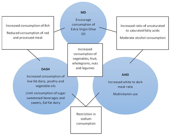 Considering the dietary patterns identified within this review, four distinct groups were identified: those considered to be ‘healthy’ dietary patterns (the largest group), those focussing on the glycaemic index, those centred around plant- versus animal-based dietary components, and one pattern quantifying the diet’s inflammatory potential. Whether the specific patterns studied are ideal in terms of components related to the health outcome is uncertain. Six identified patterns are considered to be healthy dietary patterns which either contain similar components or have been adapted to improve the representation of culturally appropriate foods. The results of this scoping review have highlighted that healthy dietary patterns are, on the whole, associated with positive metabolic outcomes in women with a history of GDM. The large number of healthy dietary patterns makes the direct comparison of study outcomes difficult; however, there are several dietary components that are common to all of these dietary patterns. Figure 3 depicts the common features of the three most well-described ‘healthy’ dietary patterns within this review. It can be seen that the consumption of vegetables, fruits, wholegrains, nuts, and legumes are encouraged in all three diets. Some differences exist between the patterns; however, these do not necessarily reflect disparate dietary components in practical terms. For example, MD and DASH encourage reduced consumption of red and processed meats, whilst for AHEI the ratio of white to dark meat consumption is scored. The DASH and MD recommend Increased consumption of fish and DASH encourages poultry consumption. Practically, these descriptors are likely to reflect similar patterns of animal protein consumption. It is probable that the similarities between these healthy dietary patterns mediate the reduction in cardiometabolic risk and so the benefit of recommending one approach over another is uncertain. The lack of knowledge regarding the specific dietary advice that should be followed has been cited as a barrier to dietary modification in the post-partum period in women with a history of GDM []. Time restraints are also frequently cited as a barrier in this population []. The simplification of dietary advice which can be readily adapted to individual circumstances could make any proposed intervention easier to implement and improve engagement.