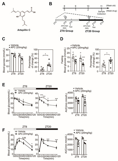 Circadian rhythmic impacts of APC on glucose metabolism in db/db mice: (A) molecular architectures of artepillin C; (B) schematic diagram of experimental scheme; (C) ad libitum blood glucose levels at ZT8 or ZT20 in db/db mice treated with 20 mg/kg APC or vehicle for 1 week (n = 5 per group). The right panel shows the percentage change in blood glucose levels at 2 different times ZT8 and ZT20; (D) after fasting 16 h, the blood glucose levels at ZT8 or ZT20 in db/db mice treated with 20 mg/kg APC or vehicle for 1 week (n = 8 per group). The right panel shows the percentage change in fasting blood glucose levels; (E) insulin tolerance test (ITT) and (F) pyruvate tolerance test (PTT) were performed around ZT8 and ZT20. The db/db mice were administrated APC (20 mg/kg) or vehicle for 2 weeks. The results of area under the curve (AUC) are shown at the bottom of each test curve (n = 3–5 per group). * p < 0.05; ** p < 0.01; *** p < 0.001.