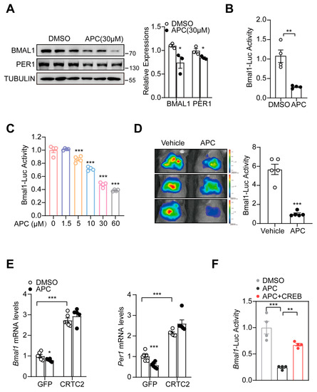 APC inhibits hepatic BMAL1 expression: (A) immunoblotting of BMAL1 and PER1 proteins in primary hepatocytes treated with 1 h of DMSO or APC (30 μM) treatment prior to 7 h glucagon stimulation (100 nM, n = 3 per treatment); (B) luciferase Bmal1−Luc activity; HEK293T cells were infected with Bmal1−Luc and RSV−β−Gal for 24 h, followed by 1 h incubation with APC (30 μM) prior to 7 h forskolin treatment before the luciferase assay (n = 4 per treatment); (C) primary hepatocytes were infected by AD−Bmal1−Luc and AD−RSV−β−Gal for 24 h, followed by 1 h incubation with APC (0, 1.5, 5, 10, 30, 60 μM) prior to 7 h glucagon stimulation (100 nM, n = 4 per treatment) Different colors represent different group treated with different concentrations of APC.; (D) live imaging assay of Bmal1−Luc activity in WT mice; the mice were tested at ZT1; (E) mRNA levels of Bmal1 and Per1 analyzed by real−time qPCR in primary mouse hepatocytes. The cells were injected with GFP− and CRTC2− expressing adenovirus for 24 h and treated with APC for 1 h prior to 8 h glucagon stimulation (100 nM, n = 6 per group); (F) luciferase Bmal1−Luc activity; HEK293T cells were infected with Bmal1−Luc, CREB, and RSV−β−Gal for 24 h, then incubated with APC (30 μM) for 1 h prior to forskolin 7 h before luciferase assay (n = 4 per treatment). * p < 0.05; ** p < 0.01; *** p < 0.001.