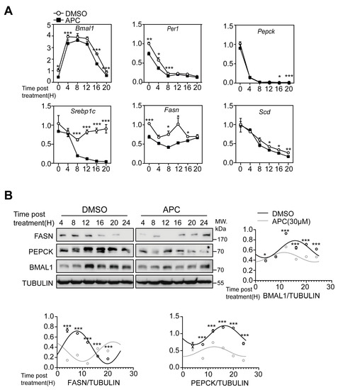 Image J and GraphPad Prism 8 were utilized to perform statistical analyses. All results are presented as the mean ± SEM. Student’s t−tests or one−way ANOVA were used to determine the presence of statistical differences. Cosinor was used to analyze the oscillations of BMAL1, FASN, and PEPCK in DMSO− or APC−treated primary hepatocytes; * p < 0.05; ** p < 0.01; *** p < 0.001 for all the figures in the following sections.