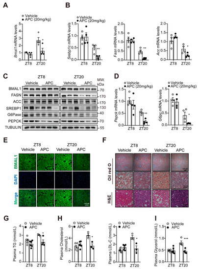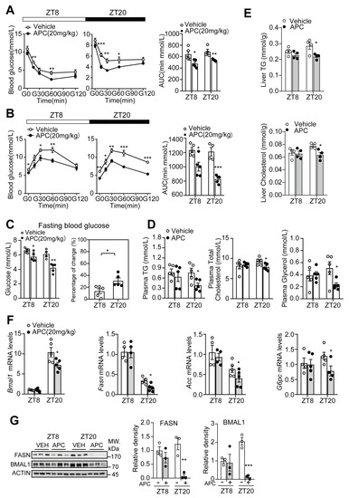APC treatment could reduce fasting glucose levels (Figure 5C), improve insulin sensitivity (Figure 5A), decrease the capacity of hepatic gluconeogenesis (Figure 5B), reduce plasma TG, TC and glycerol levels, and reduce hepatic TG and TC levels in DIO mice (Figure 5D,E). Similar to the results found in db/db mice, the ZT20 group exhibited a marked response to APC, compared to the ZT8 group (Figure 5). Subsequently, we checked the expression of relevant genes in the circadian clock and metabolism. As shown in Figure 5F,G, APC was found to remarkably reduce the mRNA levels of Bmal1, G6pc, Acc, and Fasn, as well as the protein levels of BMAL1 and FASN, in the ZT20 group, and these results were consistent with those observed in db/db mice. Taken together, these data help verify that APC suppresses BMAL1 expression and glucose and lipid metabolism in a circadian rhythmic manner. From this finding, APC could possibly regulate lipid metabolism by suppressing the transcriptional activity of BMAL1 in the liver.