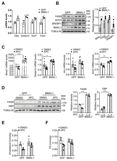 APC inhibits lipid synthesis with an effect dependent on BMAL1: (A) mRNA levels of Dbp (D site−binding protein), Srebp1c, Scd1, and Fasn analyzed by real−time qPCR in primary hepatocytes. The cells were infected with GFP− and BMAL1− expressing adenovirus for 24 h (n = 3 per group); (B) Western blots of BMAL1, SREBP1, SCD1, and FASN proteins in primary hepatocytes; the cells were treated as before (n = 3 per group); (C) mRNA levels of Bmal1, Srebp1c, Acc, and Scd1 analyzed by real−time qPCR in primary hepatocytes; the cells were infected with GFP− and BMAL1−expressing adenovirus for 24 h and treated with APC for 1 h prior to 18 h insulin stimulation (100 nM, n = 6 per group); (D) Western blots of DBP and FASN proteins in primary hepatocytes treated the same as (C); (E,F) the contents of TC and TG in primary hepatocytes treated as before (n = 3 per group). * p < 0.05; ** p < 0.01; *** p < 0.001.