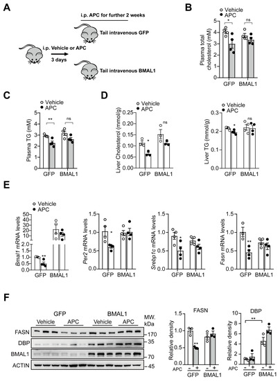 In db/db mice, APC inhibits lipid synthesis in a BMAL1−dependent manner at ZT20: (A) schematic description of animal experiments. The mice were treated with vehicle or APC (20 mg/kg) at ZT17. The experiments and sample collection were performed at ZT20; (B,C) the contents of plasma total cholesterol and plasma triglyceride (TG) in the db/db mice. The mice were treated the same way as (A) (n = 3−4 per group); (D) the levels of liver TG and TC in the db/db mice (n = 3−4 per group); (E) mRNA levels of Bmal1, Per2, Srebp1c, and Fasn analyzed by real−time qPCR in the animal livers (n of animal = 3−4 per group); (F) Western blots of BMAL1, DBP, and FASN proteins in the animal livers (n of animals = 3 per group). * p < 0.05; ** p < 0.01.